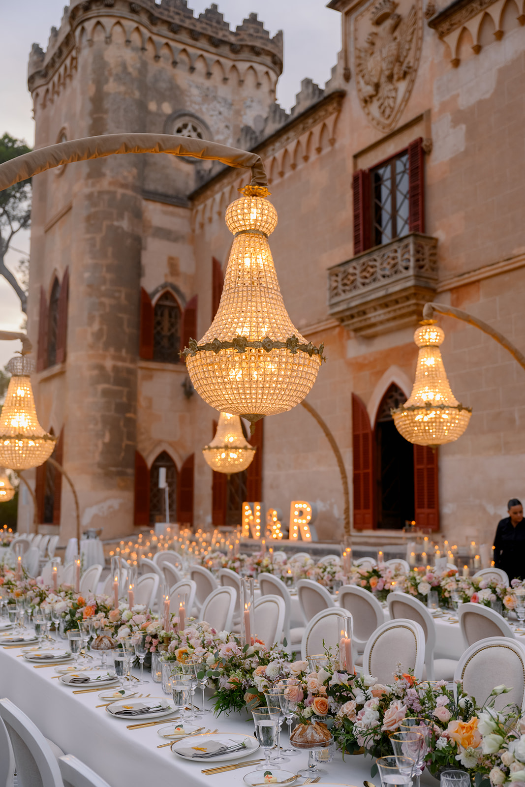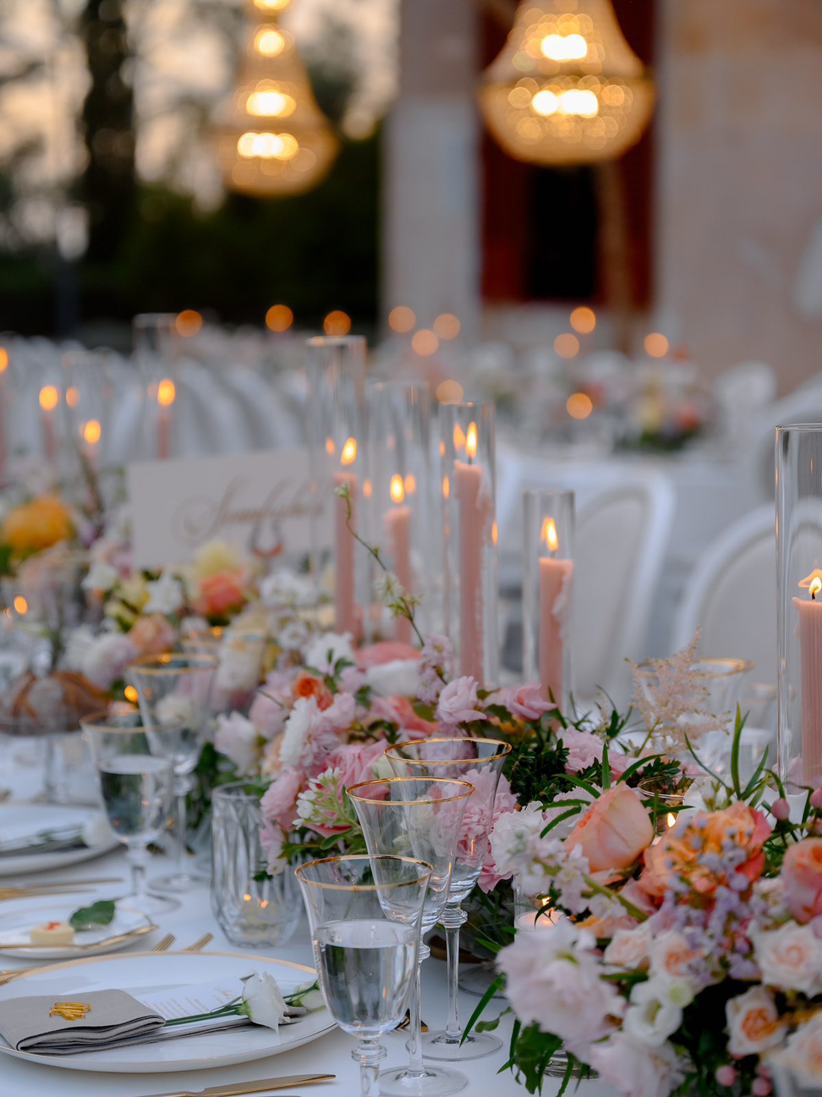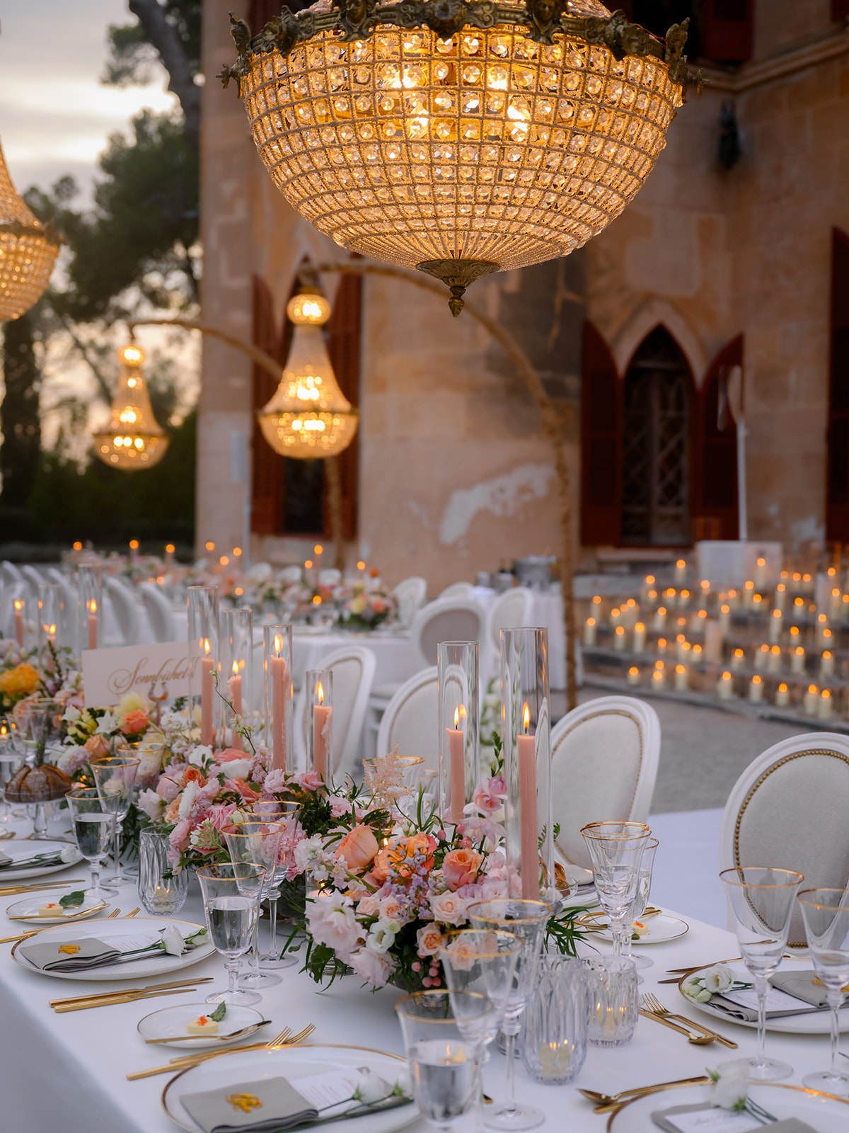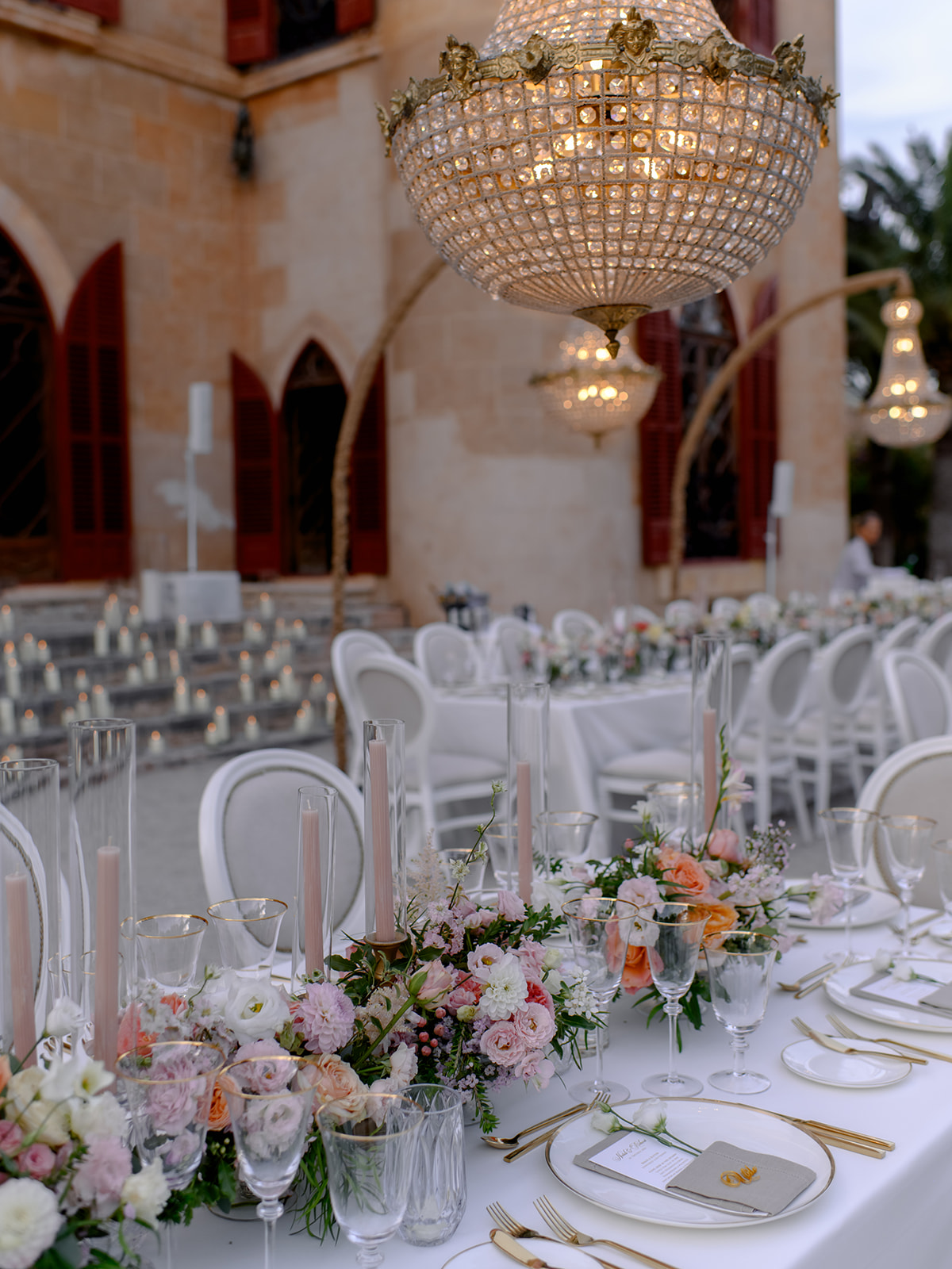Crystal chandeliers bathed the venue in beautiful light, casting a glow that was pure enchantment! The warm candlelight was a central element in the table décor, giving it an unmatched charm. Over 400 candles also adorned the steps leading to the entrance.