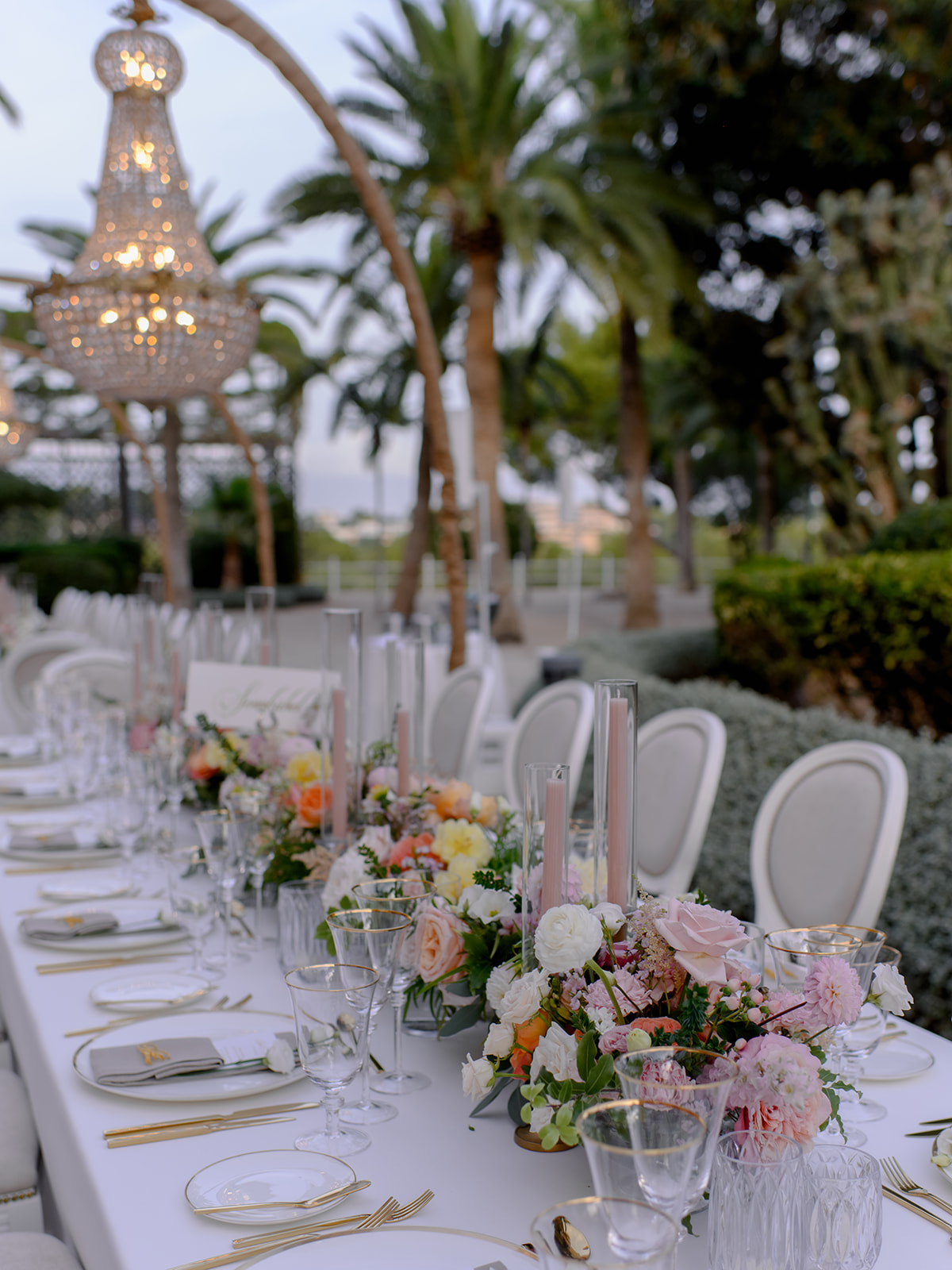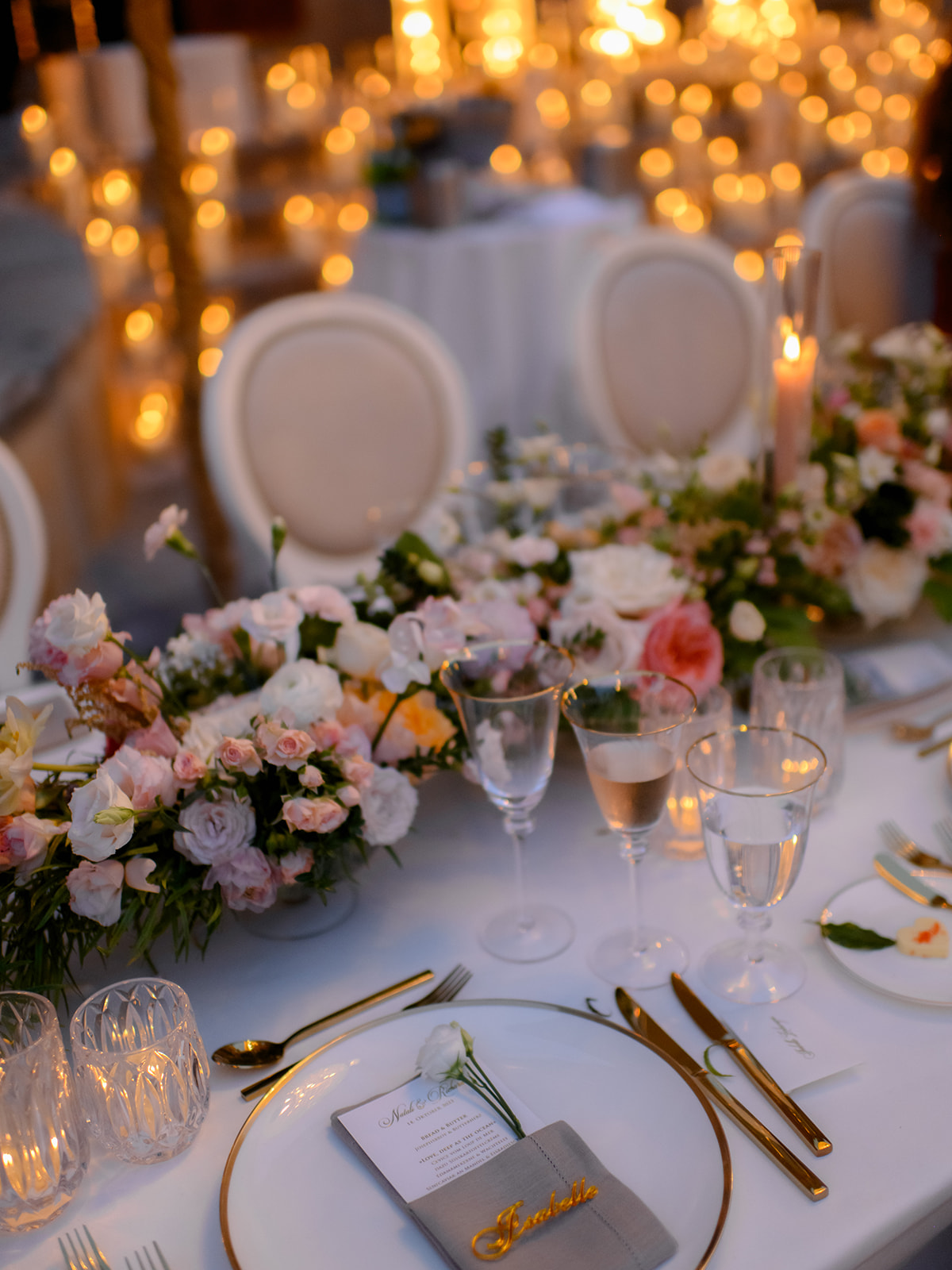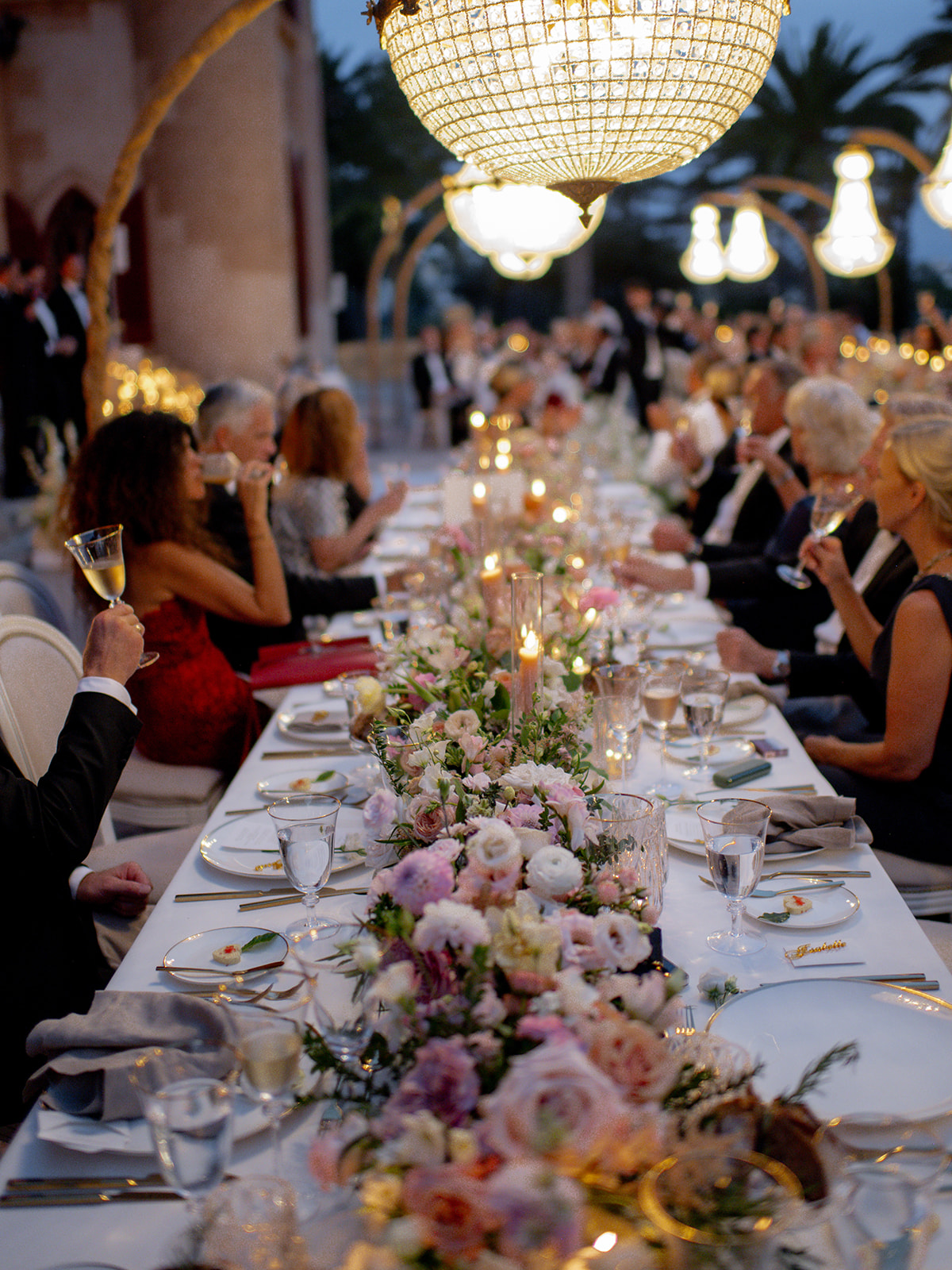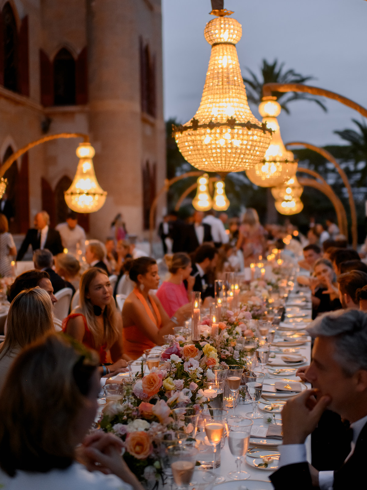Crystal chandeliers bathed the venue in beautiful light, casting a glow that was pure enchantment! The warm candlelight was a central element in the table décor, giving it an unmatched charm. Over 400 candles also adorned the steps leading to the entrance.