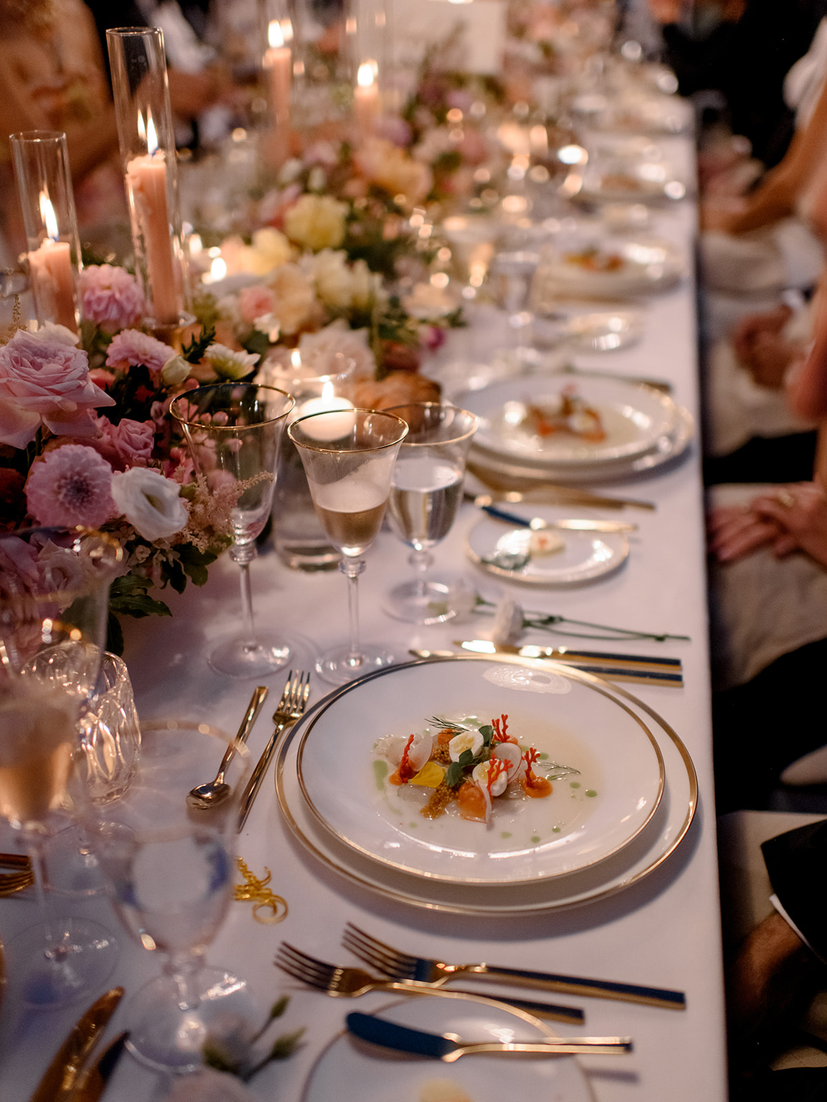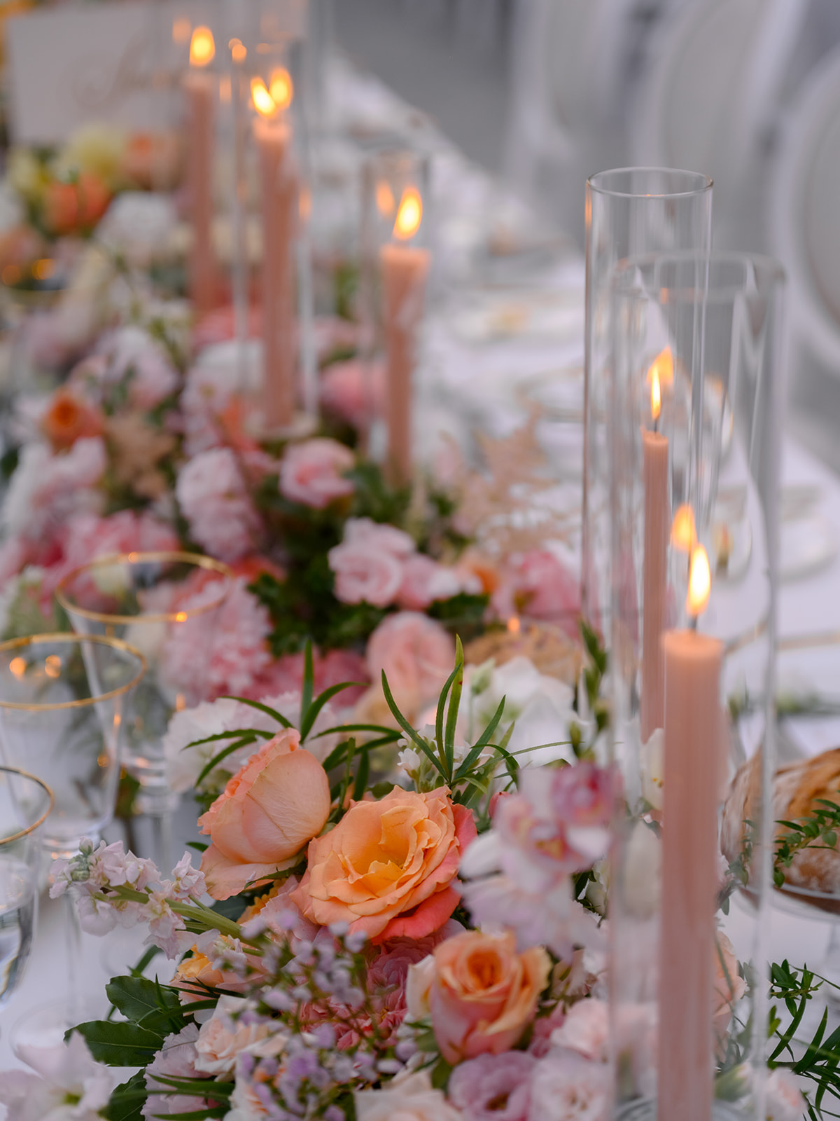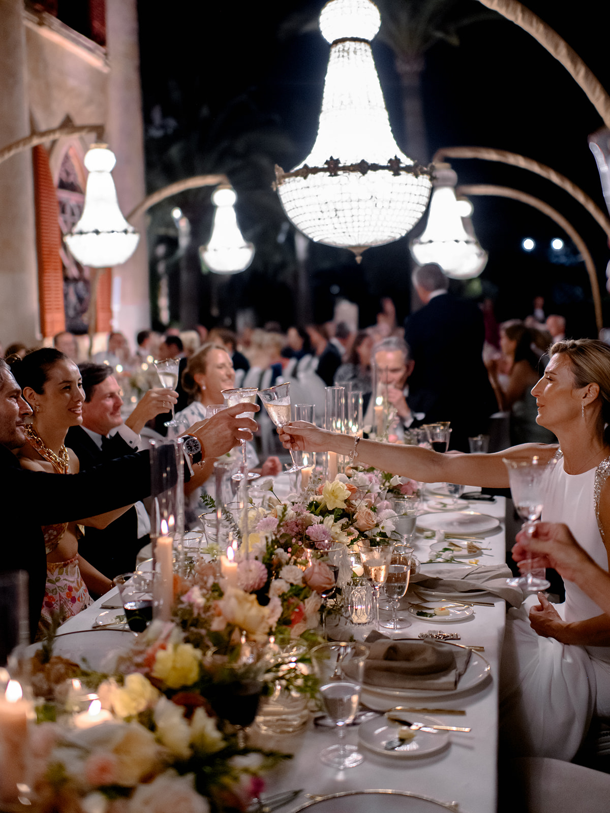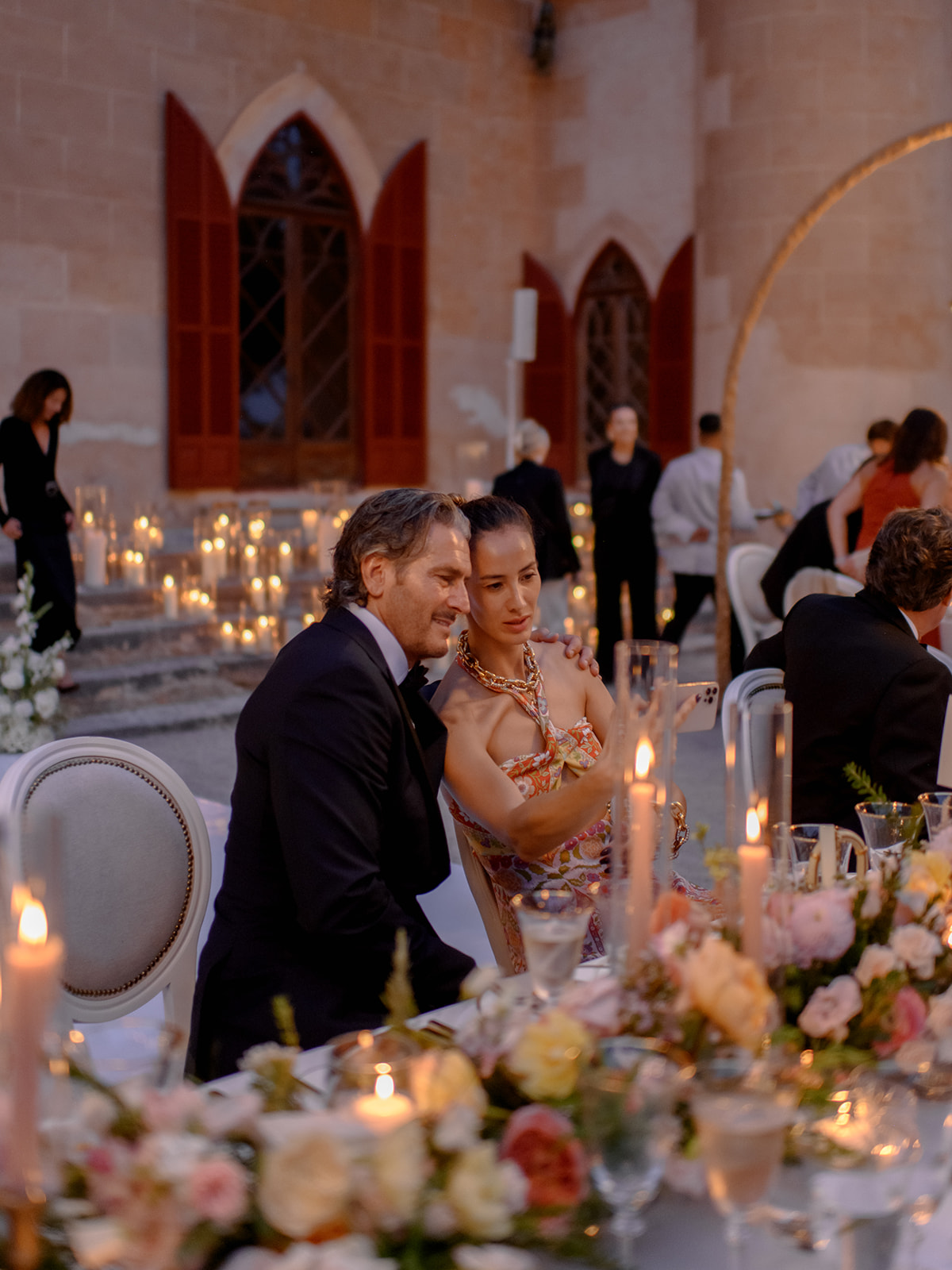 Crystal chandeliers bathed the venue in beautiful light, casting a glow that was pure enchantment! The warm candlelight was a central element in the table décor, giving it an unmatched charm. Over 400 candles also adorned the steps leading to the entrance.