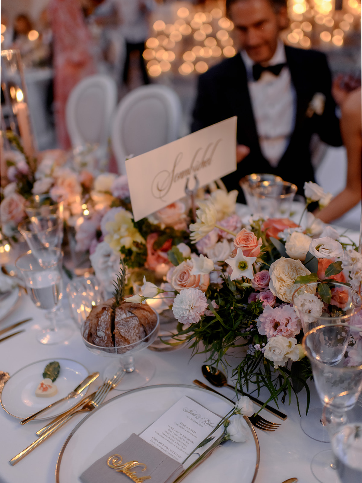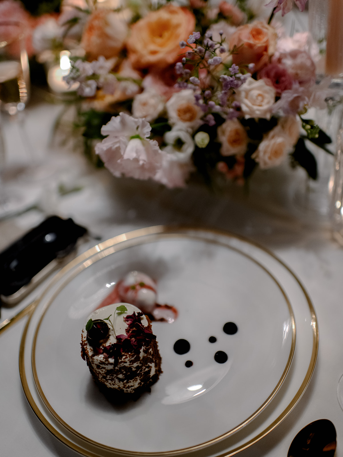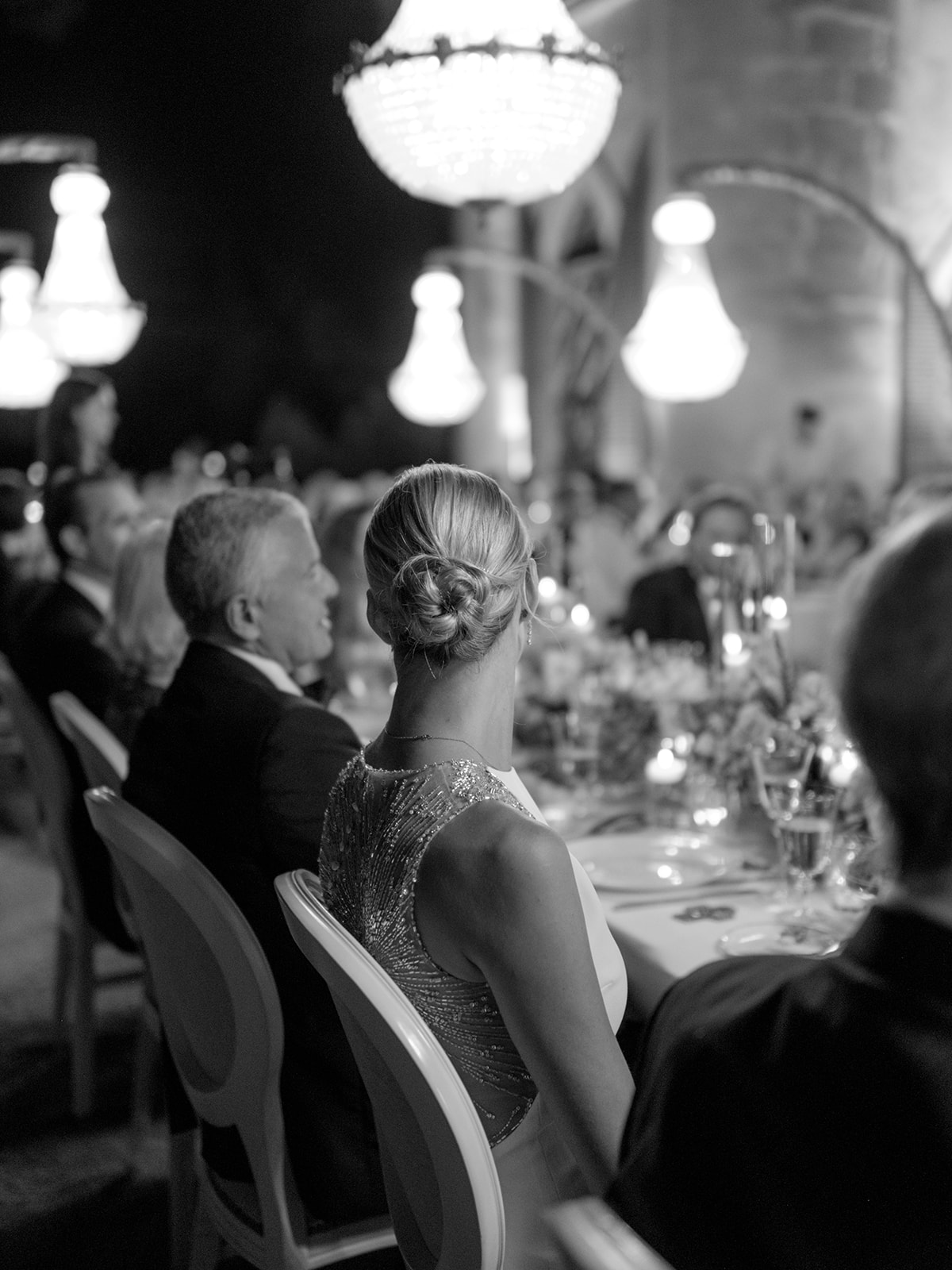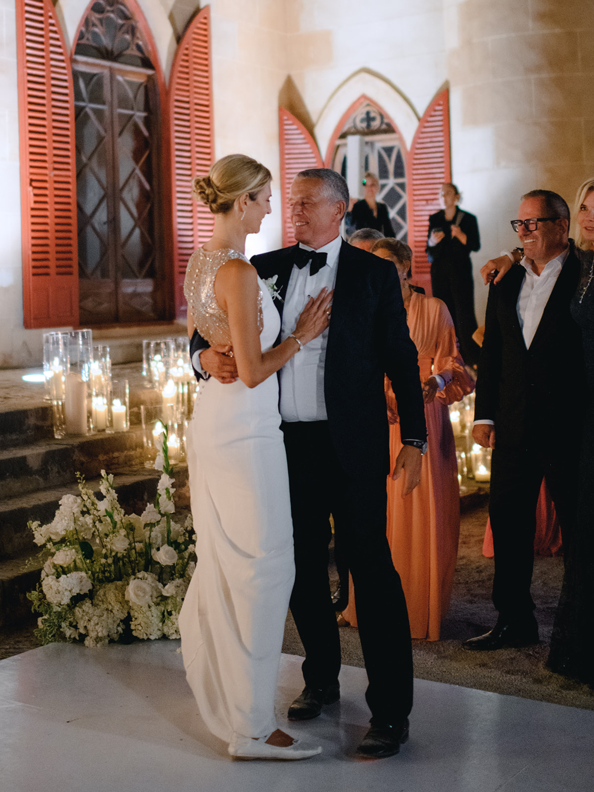 Crystal chandeliers bathed the venue in beautiful light, casting a glow that was pure enchantment! The warm candlelight was a central element in the table décor, giving it an unmatched charm. Over 400 candles also adorned the steps leading to the entrance.