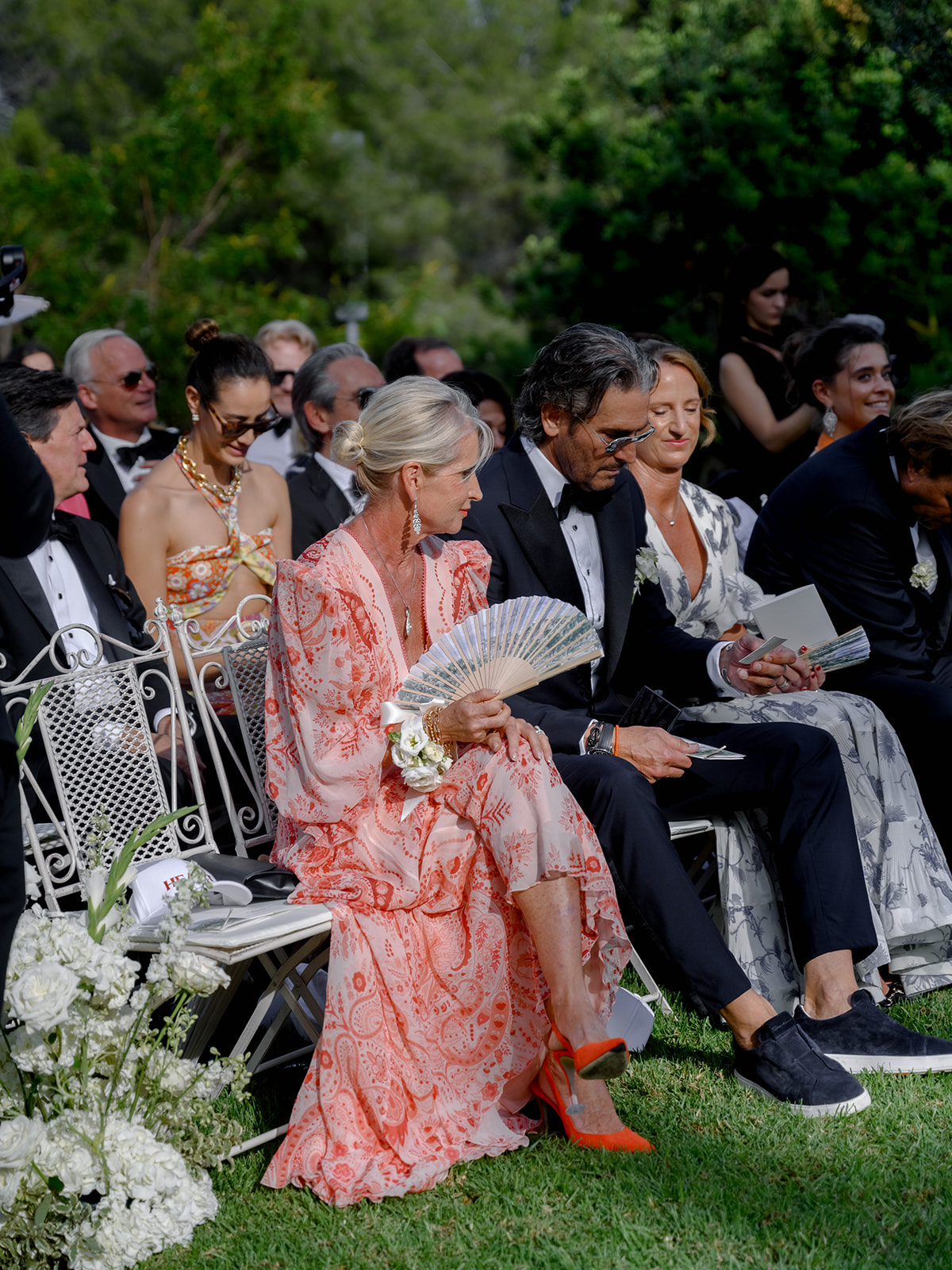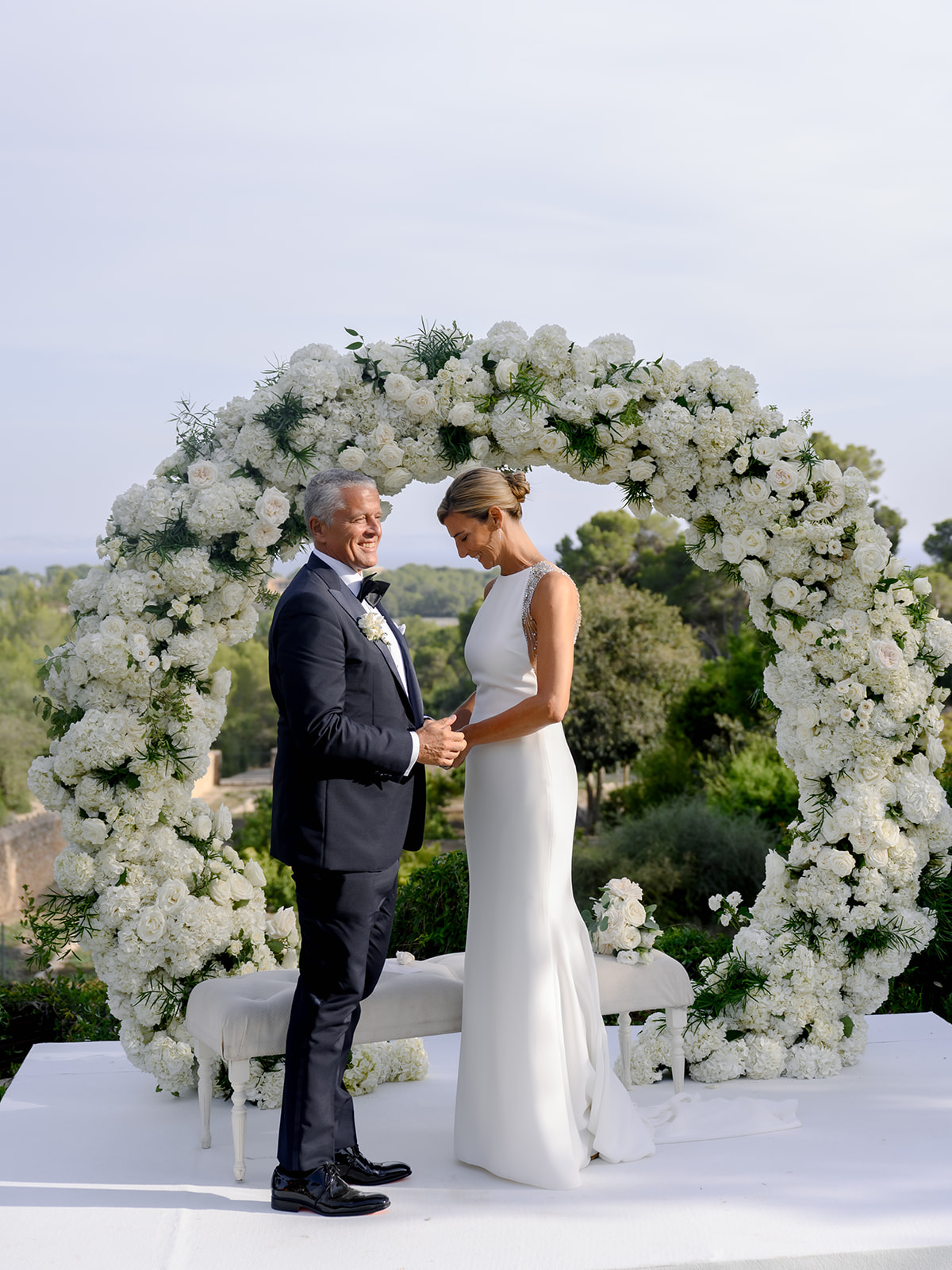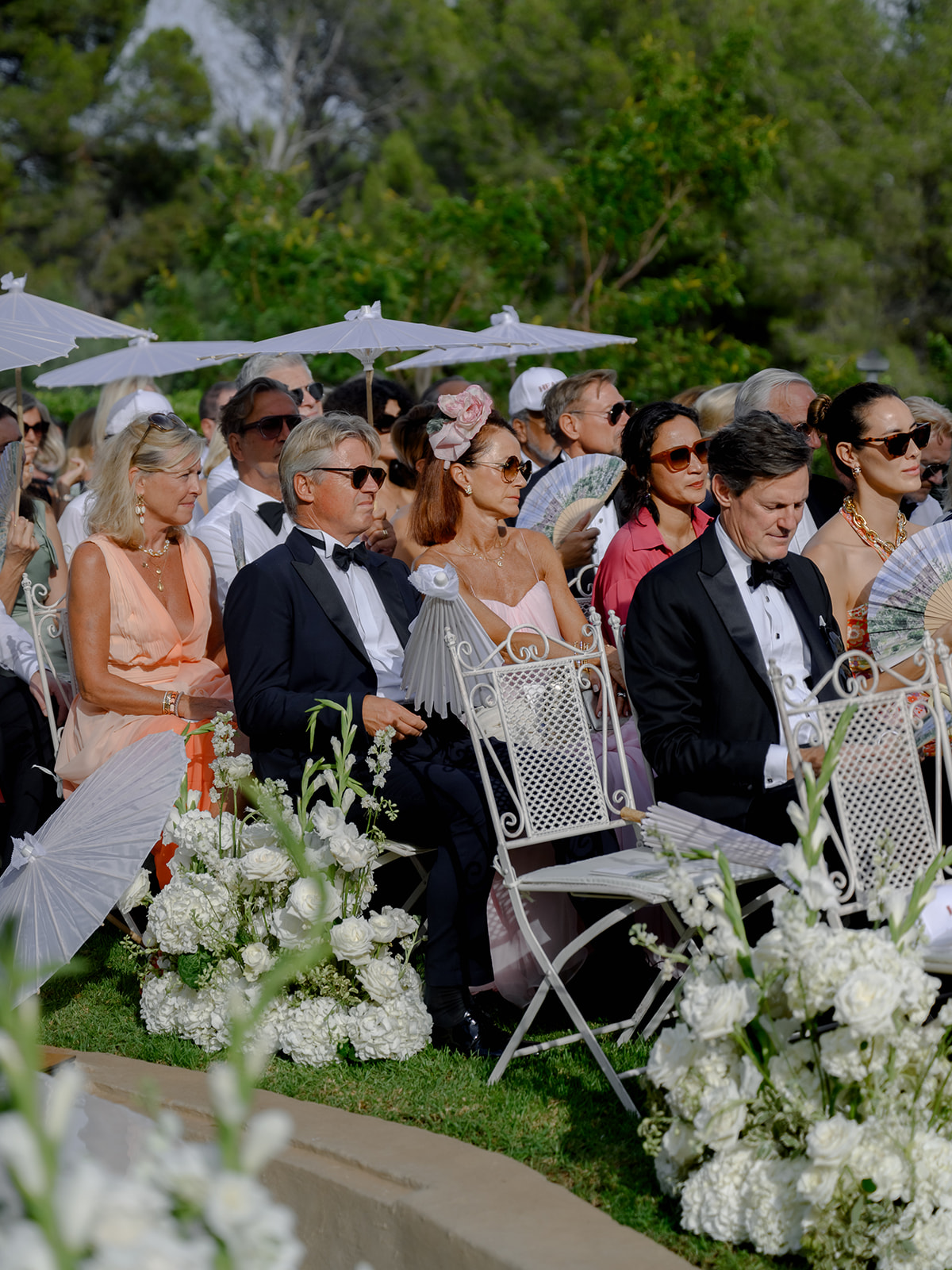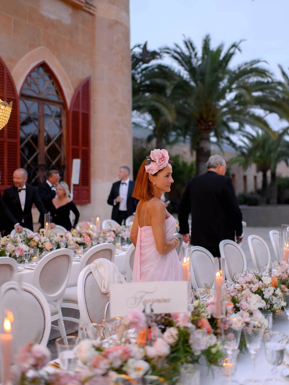 The guests were even more grateful for the thoughtful little details designed to ensure everyone’s comfort. Custom-made caps with the inscription “You’re in my heart” and hand-painted fans depicting the castle were handed out, along with refreshing towels and, of course, the all-important heel protectors when you get married in Mallorca.
