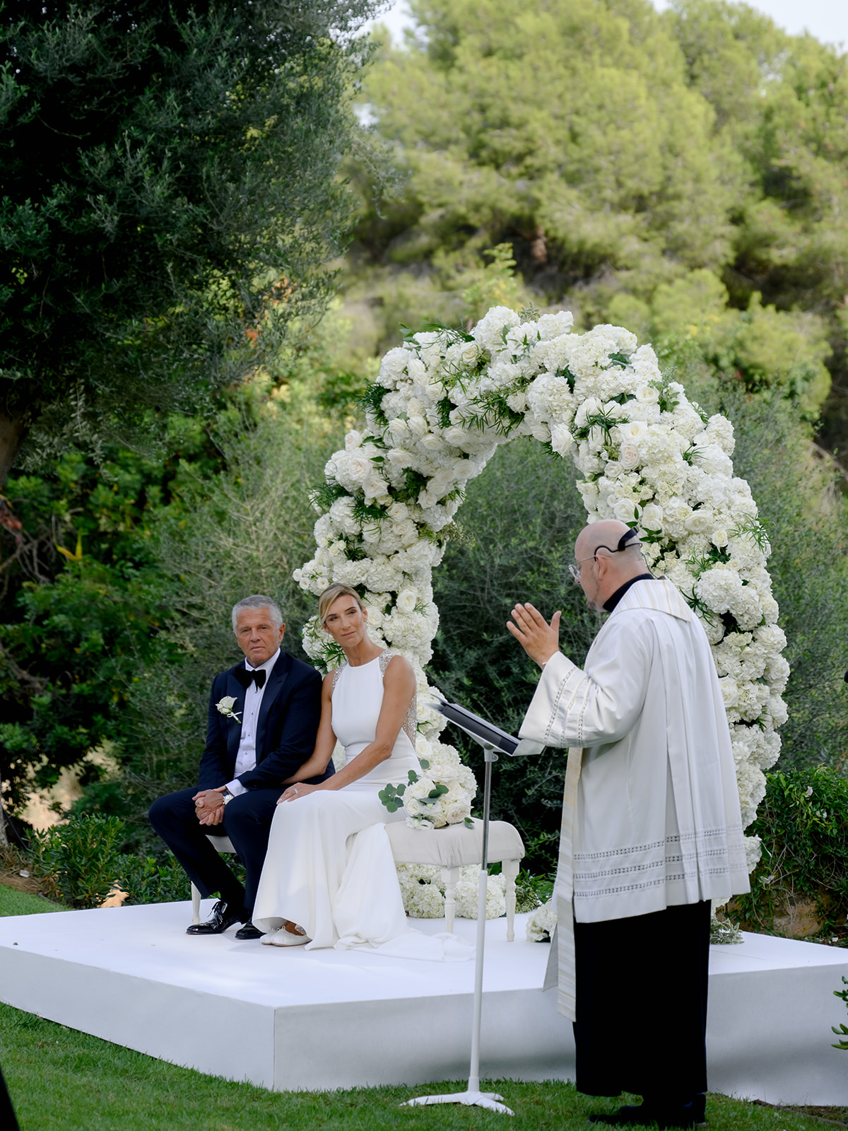 The ceremony was officiated by a priest from Germany, who also performs non-denominational weddings. A major highlight was our live singer **Blanca**, who surprised the couple by stopping her show at “Lio” to sing their favorite song from the bridge. It was pure goosebumps!